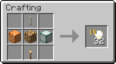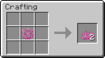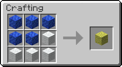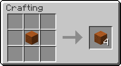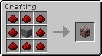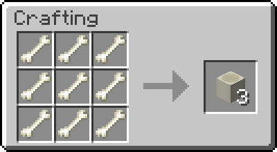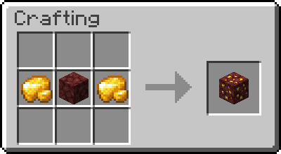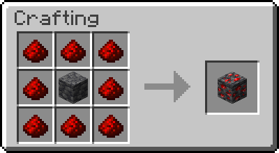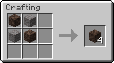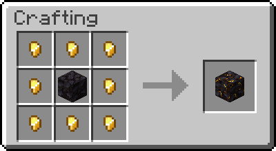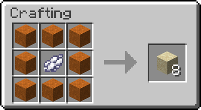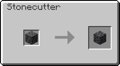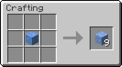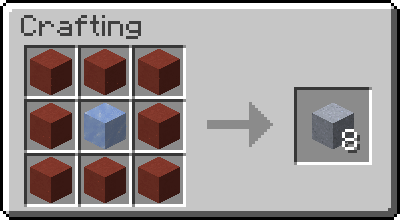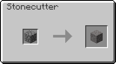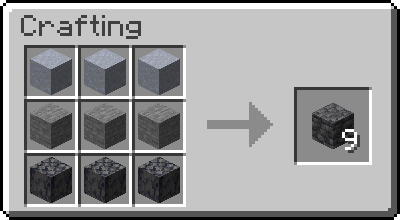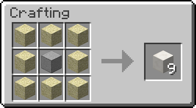 Custom Recipes Stonecutter: Bricks1 Terracotta → 1 Brick Block Cobbled Deepslate1 Deepslate → 1 Cobbled Deepslate Gravel1 Cobblestone → 1 Gravel Raw Ore1 [type] Ingot → 1 [type] Raw Ore Sand1 Gravel → 1 Sand Furnace/Blast: Blackstone1 Basalt → 1 Blackstone Diamond1 Coal Block → 1 Diamond[100 minutes] Dead Bush1 [type] Sapling → 1 Dead Bush Leather1 Rotten Flesh → 1 Leather Crafting Table: Bone Block9 Bones → 3 Bone Blocks Blue Ice1 Blue Ice → 9 Packed Ice Coral1 [type] Coral Block → 4 [type] Coral Coral Block8 Bone Blocks + 1 [type] Coral Block → 9 [type] Coral Block Coral Fan1 [type] Coral → 2 [type] Coral Fan Calcite4 Dripstone Blocks + 4 Stone + 1 Bone Block → 9 Calcite Clay8 [type] Terracotta + 1 Ice → 8 Clay Deepslate3 Clay + 3 Stone + 3 Basalt → 9 Deepslate Deepslate Ore4 or 8 [type] Material + 1 Deepslate → 1 [type] Deepslate Ore Dispenser3 Sticks + 3 Strings + 1 Dropper → 1 Dispenser Enchanted Golden Apple8 Blocks of Gold + 1 Apple → 1 Enchanted Golden Apple Gilded Blackstone9 Gold Nuggets + 1 Blackstone → 1 Gilded Blackstone Heart of the Sea4 Blue Ice + 4 Sea Lanterns + 1 Block of Diamond → 1 Heart of the Sea Horse Armor1 Lead + 1 Saddle + 6 [type] Material → 1 [type] Horse Armor Light1 End Rod + 1 Shroomlight + 1 Glowstone + 1 Sea Lantern + 1 Torch → 32 Lights Nether Ore2 or 4 [type] Material + 1 Netherrack → 1 Nether [type] Ore Ore4 or 8 [type] Material + 1 Stone → 1 [type] Ore Otherside Music Disc2 Deepslate Diamond Ore + 2 Deepslate Emerald Ore + 1 Powder Snow Bucket + 1 Raw Copper + 1 Amethyst Shard + 1 Spore Blossom + 1 Disc (11) → 1 Disc (Otherside) Packed Ice1 Packed Ice → 9 Ice Podzol1 [type] Leaves + 1 Dirt → 1 Podzol Quartz8 Sand + 1 Smooth Stone → 9 Blocks of Quartz Red Nether Brick2 Nether Bricks + 2 Nether Wart Blocks → 4 Red Nether Bricks Sandstone1 [type] Sandstone → 4 [type] Sand Sand Conversion8 [type] Sand + 1 [type] Dye → 8 [type] Sand Soul Soil2 Soul Sand + 2 Gravel → 4 Soul Soil Sponge5 [type] Coral Blocks + 4 [type] Wool → 1 Sponge Block